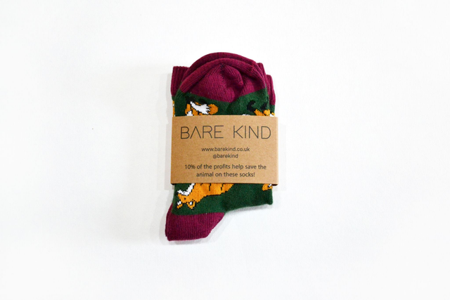 Fox design, green/burgandy, bamboo socks that help to save endangered animals - Bare Kind donate 10% of profits from these socks to the Brent Lodge Wildlife Hospital.