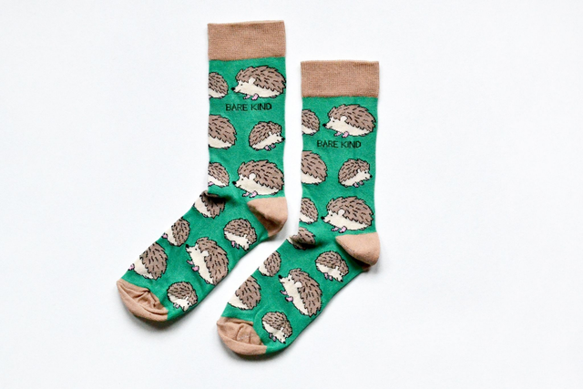 Hedgehog design, beige/green, bamboo socks that help to save animals - Bare Kind donate 10% of profits from these socks to the British Hedgehog Preservation Society.
