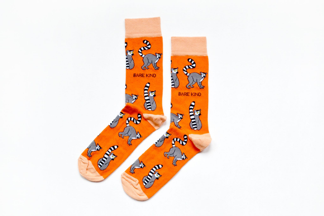 Lemur design, orange, bamboo socks that help to save endangered animals - Bare Kind donate 10% of profits from these socks to The Rainforest Trust UK.