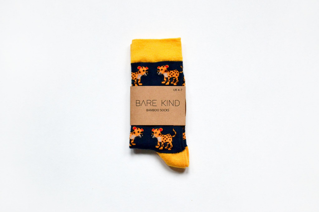Leopard design, navy/yellow bamboo socks that help to save endangered animals - Bare Kind donate 10% of profits from these socks to the Rainforest Trust UK.