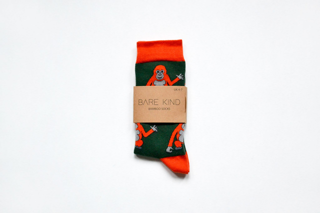 Orangutan design, green/orange bamboo socks that help to save endangered animals - Bare Kind donate 10% of profits from these socks to The Orangutan Foundation.