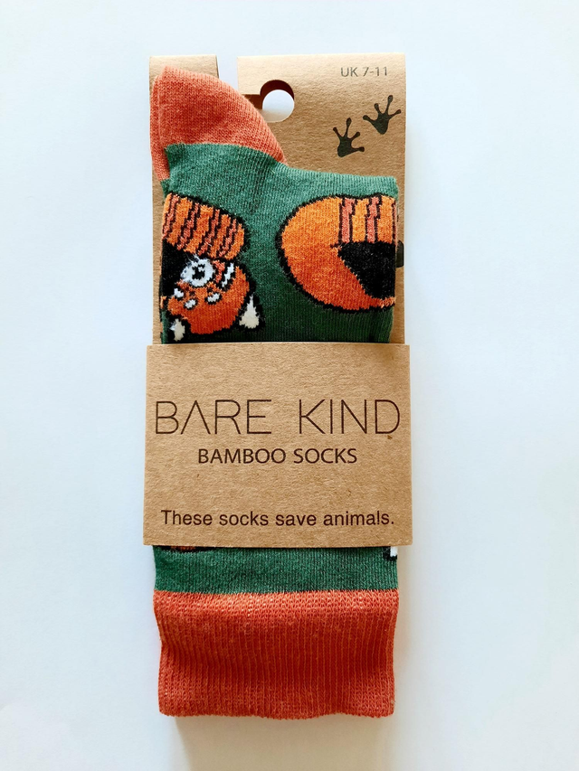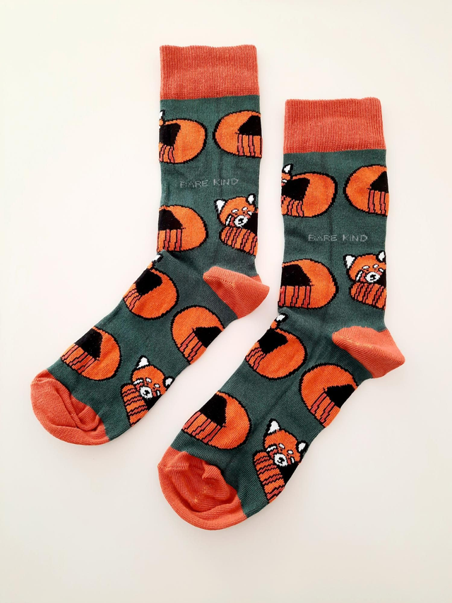 Red Panda design, green/orange, bamboo socks that help to save endangered animals - Bare Kind donate 10% of profits from these socks to the Rainforest Trust UK.