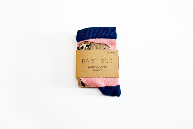 Sloth design, pink/navy bamboo socks that help to save endangered animals - Bare Kind donate 10% of profits from these socks to The Rainforest Trust UK.