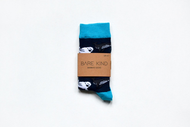Whale design, navy/turquoise bamboo socks that help to save endangered animals - Bare Kind donate 10% of profits from these socks to Whale and Dolphin Conservation.